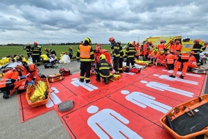 Cvičení na brněnském letišti. Zásah IZS složek při náhlé dekompresi letadla. Na místě 36 raněných ze 130 osob na palubě. Naši žáci v roli modelů...