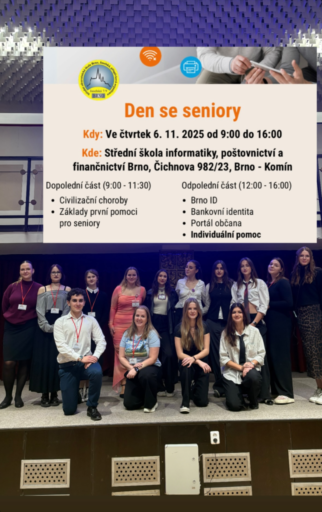 Ve čtvrtek 5. listopadu se uskutečnila akce Den se seniory, které se zúčastnilo více než 80 seniorů. Akce proběhla díky skvělé spolupráci školního parlamentu naší školy a parlamentu SŠ Čichnova. Naši žáci si pro seniory připravili prezentace, ukázku první pomoci a ochotně pomáhali se vším, co bylo potřeba. Děkujeme všem, kteří se na akci podíleli!
